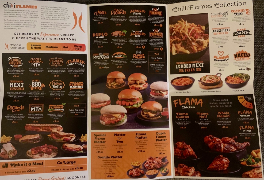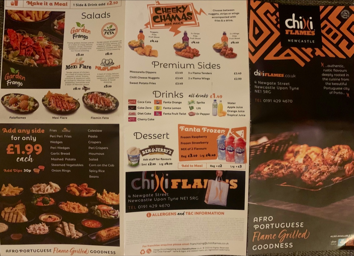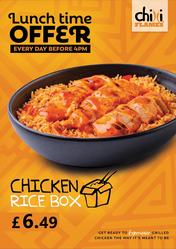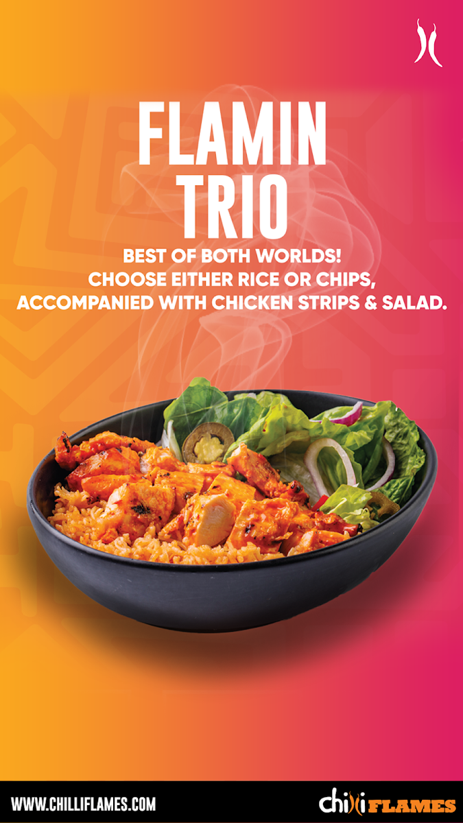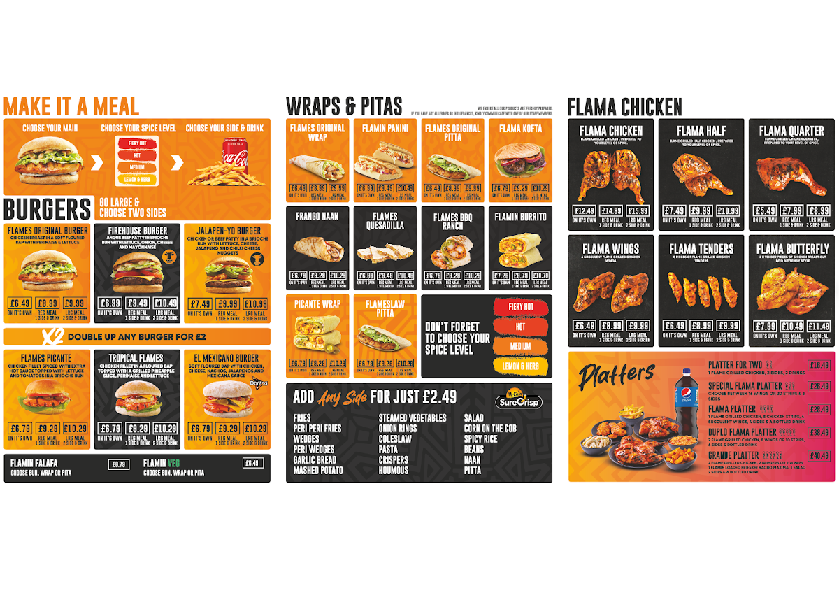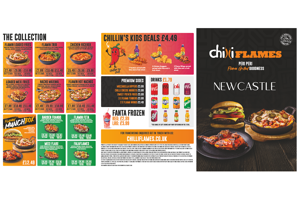 Chilli Flames in Newcastle offers a diverse and mouth-watering menu, perfect for anyone craving bold flavors and hearty portions. For those dining in groups, the shared meals like the Flame Pot with Corn on the Cob and your choice of drink, or the Chicken Rice Box paired with Coleslaw, offer a great way to enjoy a filling meal together. The Flames Original Burger served with Sweet Potato Fries is a crowd favorite, while the Chicken Rice Box is available for a buy-one-get-one-free deal, making it a perfect choice for sharing. The Single Set Meals feature a variety of combinations such as the Flames Original Burger with Onion Rings and a Coca-Cola Zero Sugar 330ml. For a more indulgent experience, the Flamin’ Munchbox with the Flames Original Burger or Firehouse Burger (5oz Angus Beef) is highly recommended. Their extensive burger selection includes bold options like the Flamin' Chicken Steak Burger, Beef Jalapeno Burger, and the ever-popular Double Original Burger. Wraps and pittas like the Flames Original Wrap and Flamin' Panini cater to those in the mood for something lighter but equally delicious. The menu also offers whole meals like the Whole Flamin' Chicken and crispy options like the Flama Wings and Flama Tenders. For a healthier option, the Flames Mexi Salad and Feta Salad provide a refreshing side dish. Kids are also well taken care of with meals like 3 Nuggets with Fries and a Drink. Don’t forget to pair your meal with some premium sides, such as Sweet Potato Fries or Mozzarella Dippers, and finish it off with a Ben & Jerry’s ice cream like Chocolate Fudge Brownie. With a wide range of drinks, sides, and dip pots like Garlic Mayo and Perinaisse, Chilli Flames ensures a satisfying dining experience for all tastes and preferences.