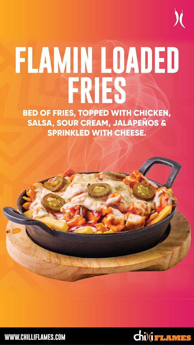Flames original burger 3 wings loaded fries 2 chilli cheese nuggets